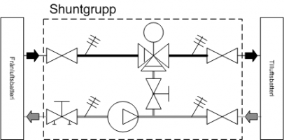 Shuntgrupp med 3-vägsventil som arbetar med variabelt flöde i tilluftskretsen och konstant flöde i frånluftsbatteriet. Används vid vattenburen återvinning. Under styrventilen sitter en balansventil för att balancera flödet från 0-100% återvinning. Till dessa system behövs ett blandningskärl, expansionskärl och en säkerhetskombination.